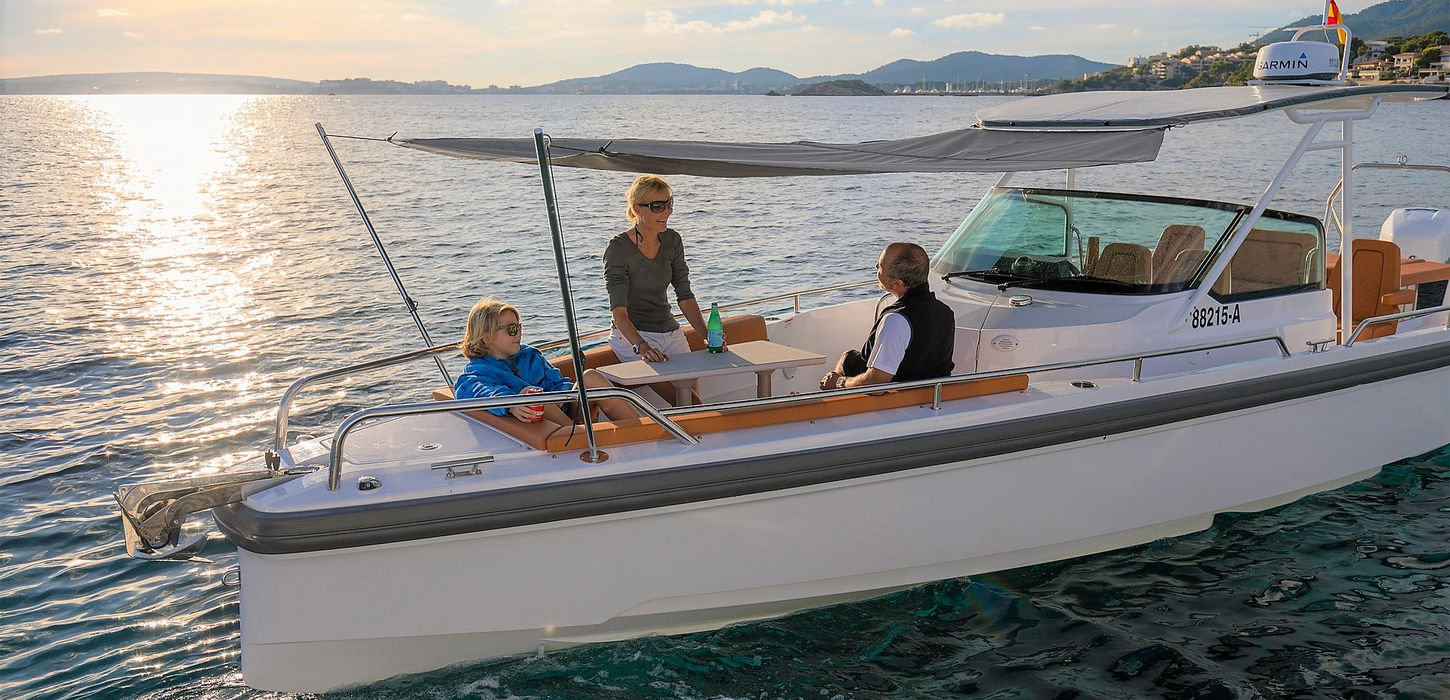 Multi awarded Motor Boat in the category of Sport Boats! The Axopar concept is based on the unique advantages of Rib boats with an ultimate modern design which combines a smart T-Top with large canvas roof shade mounted to a sturdy and permanent metal frame. This multifunctional craft has plenty of room thanks to its spacious configuration for sun-bathing, water-sports, fishing, socialising or just cruising the cost.