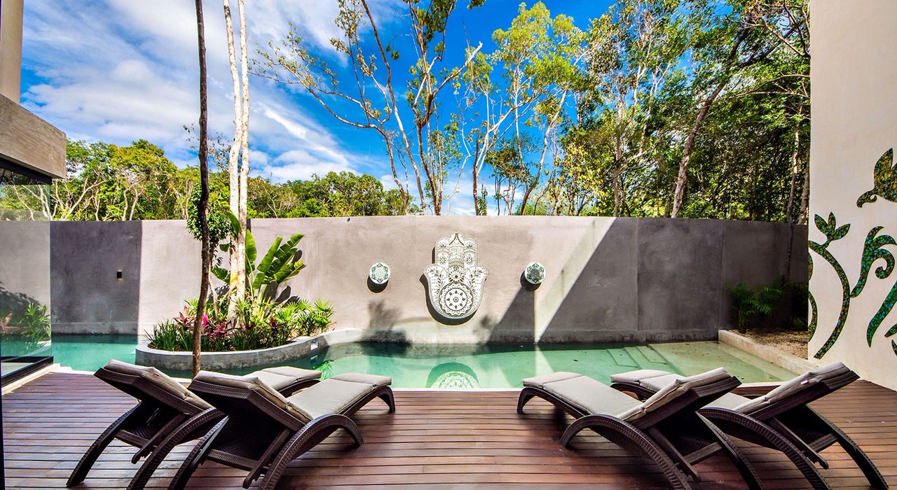 The magnificent entrance to Tulum Dream Villa will take your breath away. Step into another world and into a lavish and majestic Zen-like lounge and living area, furnished with original Balinese and Moroccan art. This space is perfect for relaxing, hosting social events, as well as yoga and healing sessions. Masterfully decorated, Moroccan lamps hang effortlessly from the soaring 25 ft high ceiling, while below colorful hand woven rugs and leather poofs imported from Morocco blanket the floor. It’s a spectacular feast for the eyes!