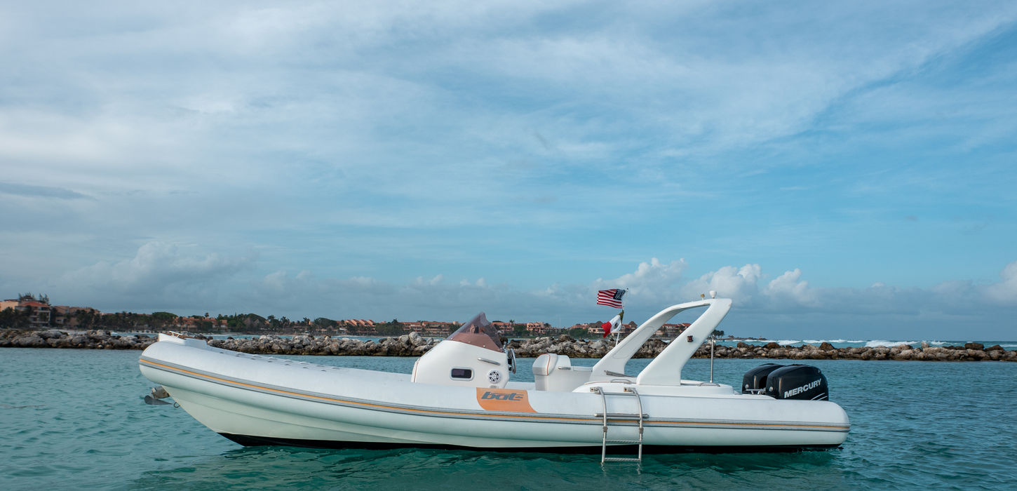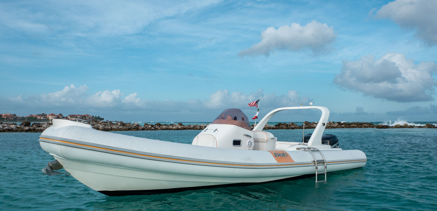 The super-fast boat has two outboard motors and can reach 81km per hour. It has a capacity of up to 6 people. There are large, comfortable sofas on the prow and stern where you will be able to enjoy the soft breeze of the Caribbean Sea. It also features a large shaded section at the rear with a spacious sofa area, and a large cushioned at the front, perfect for sun seekers.