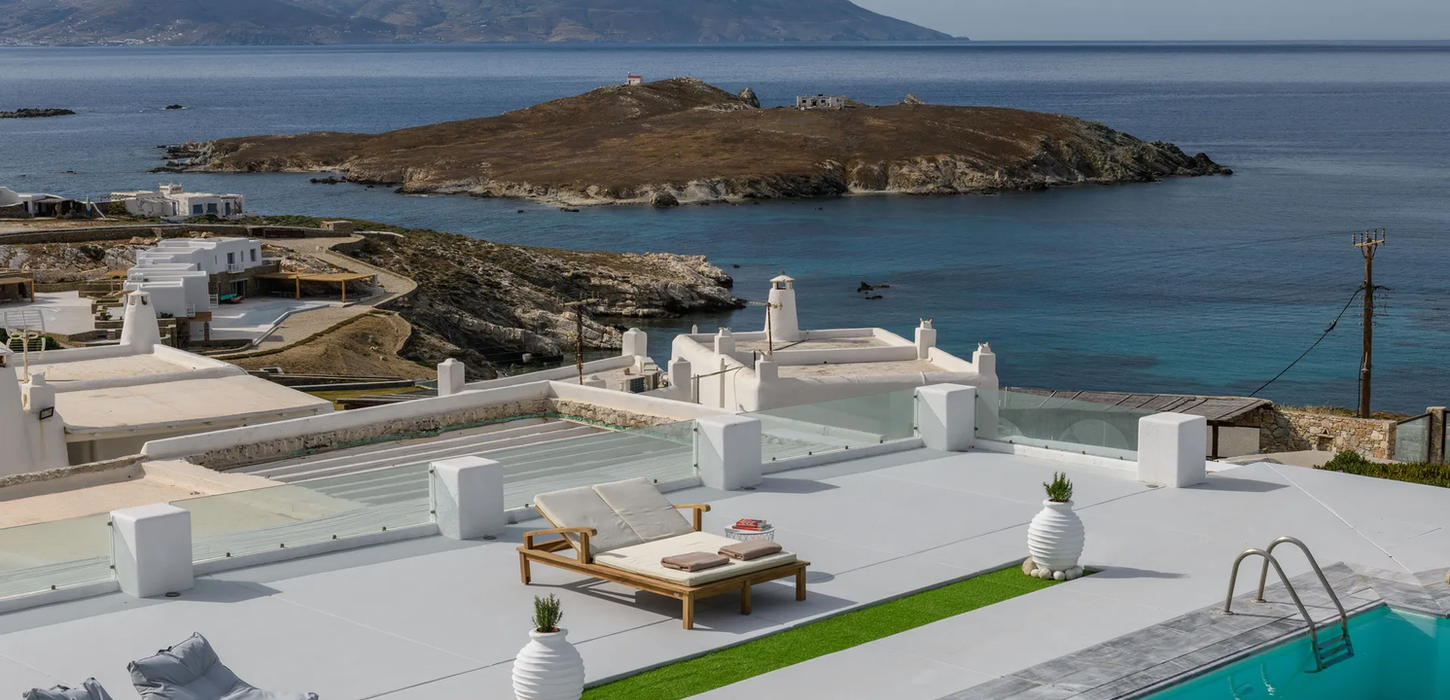 Villa Charm is a newly renovated property in Kanalia with amazing unobstructed views of the sea, Mykonos Town and the famous Cycladic sunset.