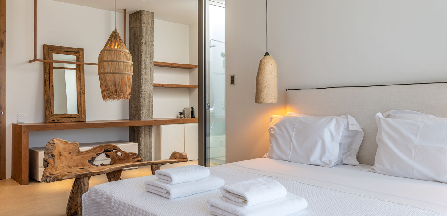 décor with wooden elements, whose construction was completed in 2019. It may comfortably accommodate up to 12 guests and is situated close to Mykonos center (Chora) but on an exceptionally private and quiet location in Tourlos, overlooking Agios Stefanos bay. Due to its distinctive design, each and every room of the property faces the western Aegean Sea and enjoys amazing unobstructed sea sunset views.
