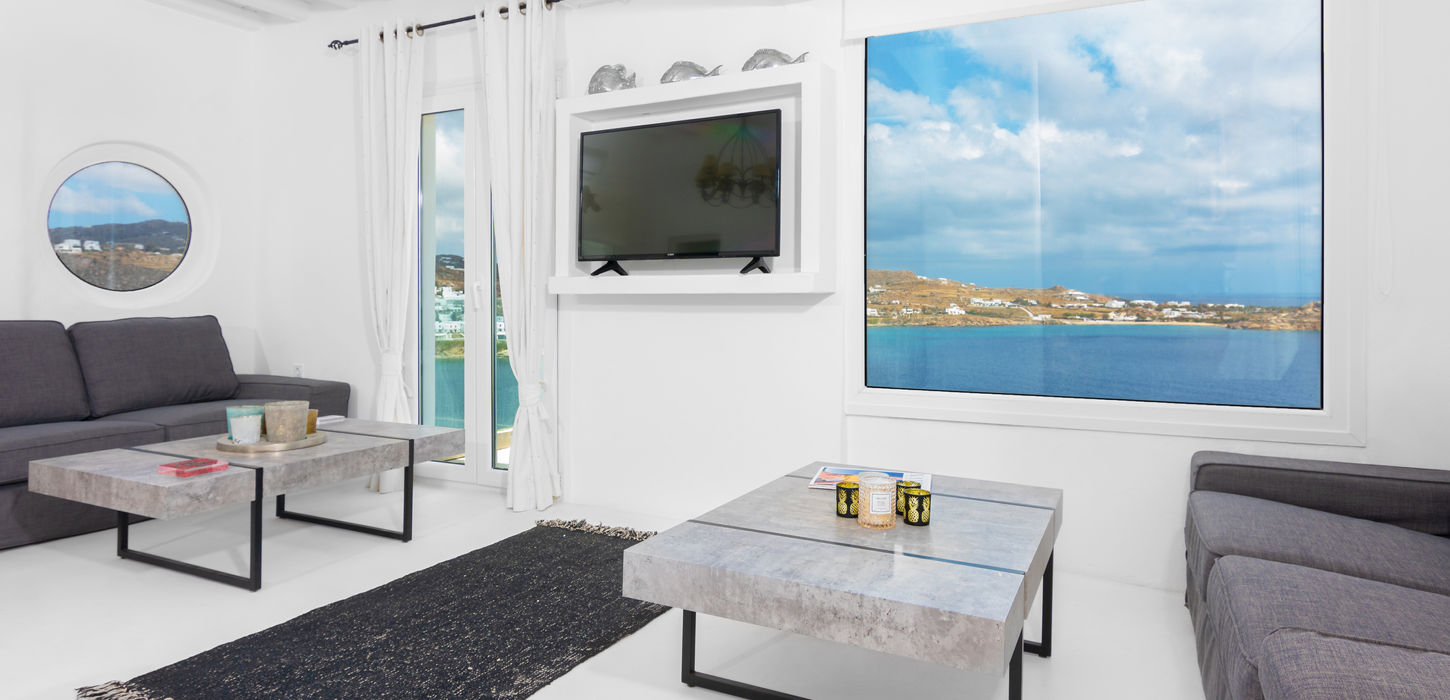 The villa offers an outdoor pool, 5 en-suite bedrooms with double luxury beds, a large kitchen, a living room with a breathtaking view, one indoor & 2 outdoor large dining tables and a BBQ for all your friends to enjoy a meal! The villa is only 10 minutes away by car from Mykonos Town, but also offers a calm & relaxing environment by the blue mykonian sea that you are able to see both from the windows of the house and the terrace in full privacy.
